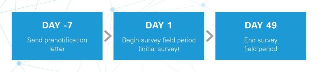 Regardless of the mode chosen, a prenotification letter must be mailed seven days prior to the first survey and the fielding period extending from 42 to 49 days starts with the first survey. Here’s a timeline breakdown: