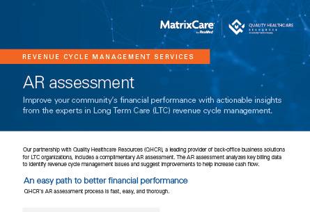Delivering quality care requires healthy finances. That’s why our partner, Quality Healthcare Resources (QHCR), offers a complimentary AR assessment to help communities and facilities collect more money, more quickly. QHCR analyzes billing data, determines baseline financial performance, and then share opportunities for improvement.