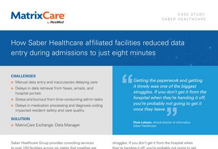 When Saber Healthcare Group had challenges with manual data entry, delays in retrieving patient information, and stress from administrative inefficiencies, they leveraged MatrixCare Exchange: Data Manager. This interoperable tool helped them reduced data entry time during admissions by 80% and improved accuracy, allowing their staff to focus on delivering high-quality care.